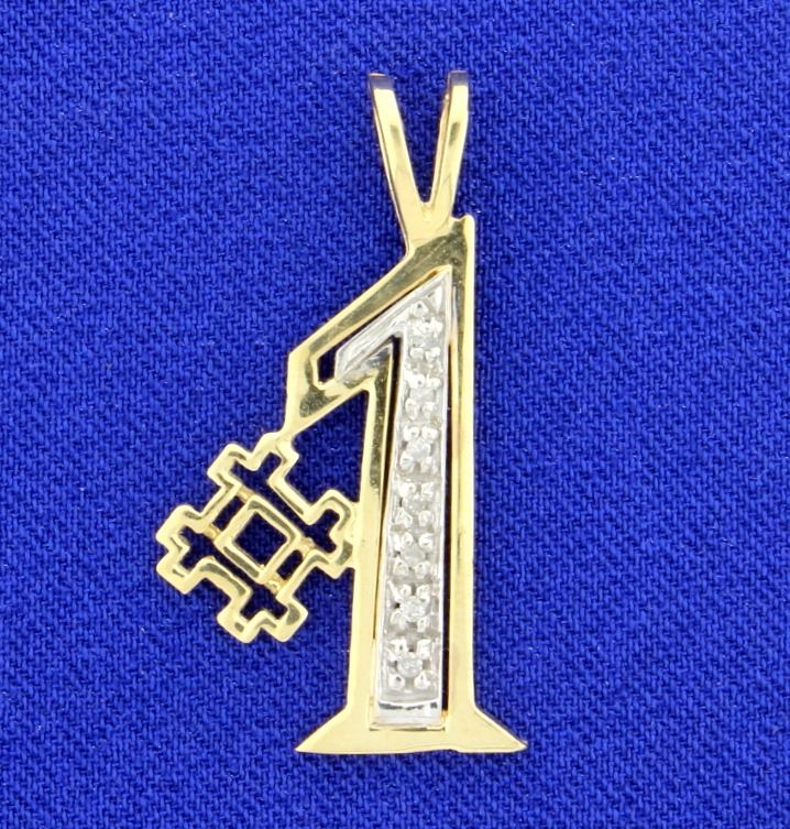 Show your support with this "#1" 14k tutone gold pendant. The outer part of design is in yellow gold, and the diamonds are set in white gold giving this piece a special twist. 1.25" long and 2.8g