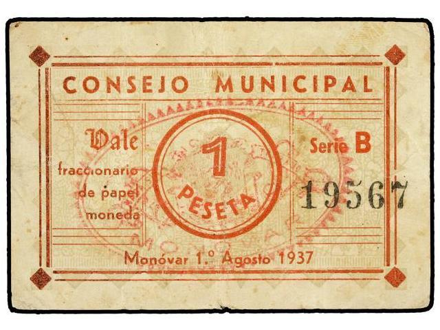 1 Peseta. 1 Agosto 1937. C.M. MONOVAR (Alicante). ESCASO. M-939C. MBC.
