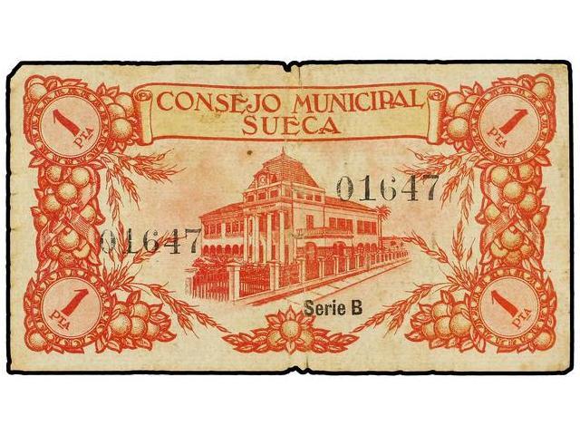 1 Peseta. 1 Junio 1937. C.M. de SUECA (Valencia). Serie B. (Pequeñas roturas). Mont-1389C; TV-1358b. MBC.
