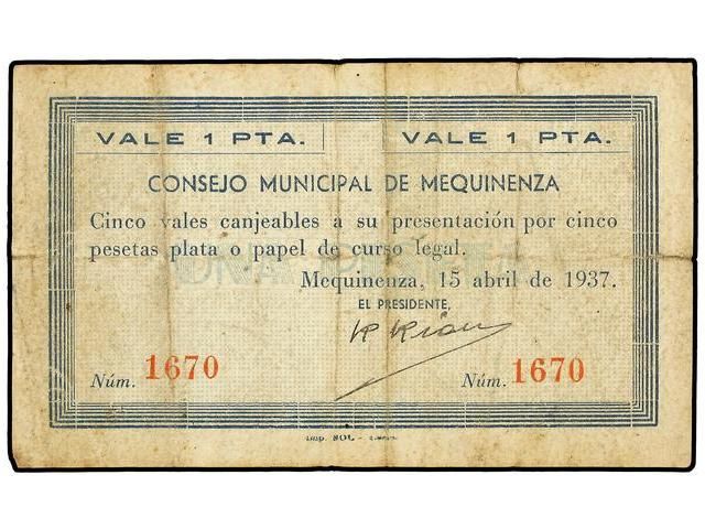 1 Peseta. 15 Abril 1937. C.M. de MEQUINENZA (Zaragoza). (Roturas y algo sucio). Mont-911C. MBC-.