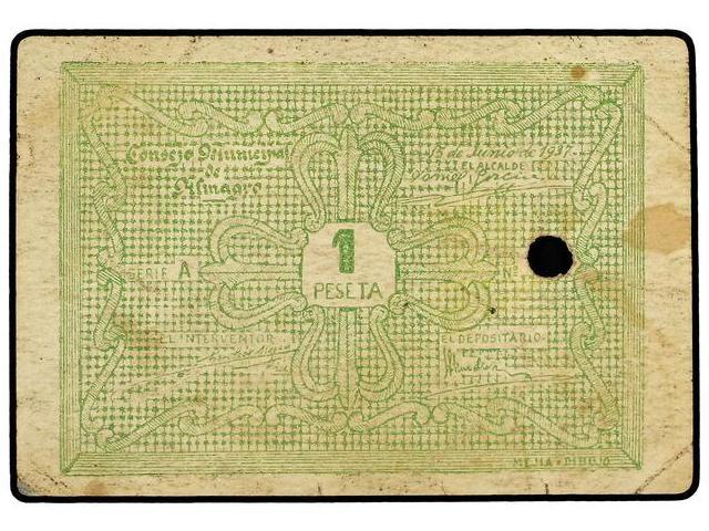 1 Peseta. 15 Junio 1937. PAPEL MONEDA S.M. ALMAGRO (Ciudad Real). Cartoncillo. (Algo sucio). ESCASO. Mont.-132/C. MBC+.