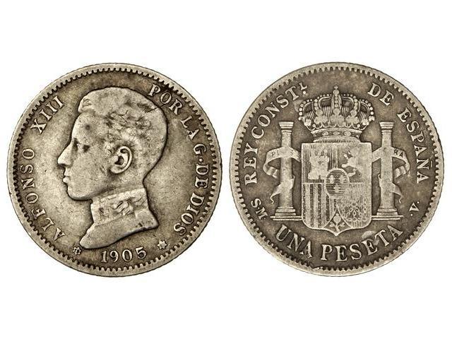 1 Peseta. 1905 (*19-0(5)). S.M.-V. Última cifra de la 2ª estrella apenas visible. ESCASA. MBC-/BC+.