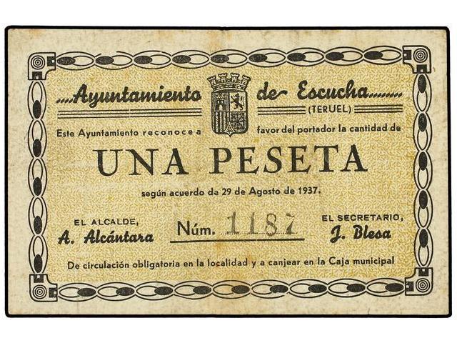 1 Peseta. 29 Agosto 1937. Ay. de ESCUCHA (Teruel). (Algo sucio). Mont-609B. MBC.