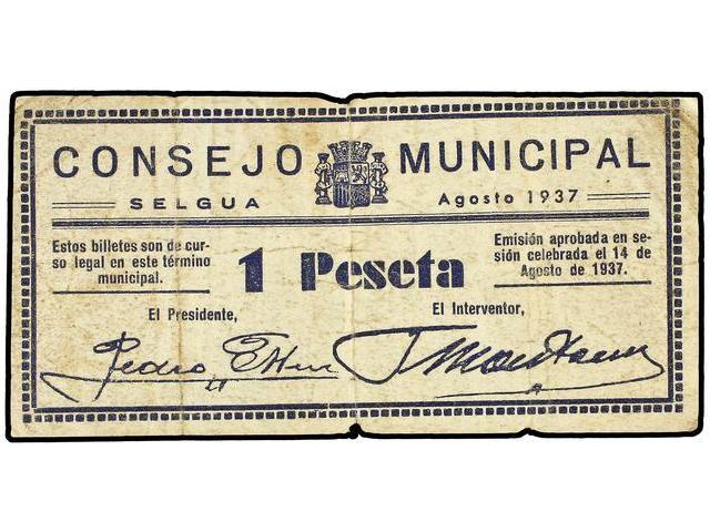 1 Peseta. Agosto 1937. C.M. de SELGUA (Huesca). (Pequeñas roturas). MBC.
