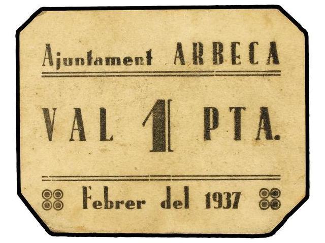 1 Peseta. - Febrero 1937. - Aj. d´ARBECA. - Cartón. Sello y número del tampón en azul. ESCASO. AT-164c; T-220c. EBC. - -