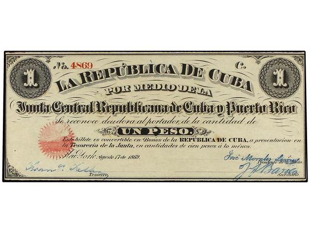 1 Peso. - 17 Agosto 1869. - JUNTA CENTRAL REPUBLICANA DE CUBA Y PUERTO RICO. - (Puntos de aguja). Ed-CU-32; LB-32CU; Pick-61. SC-. - -