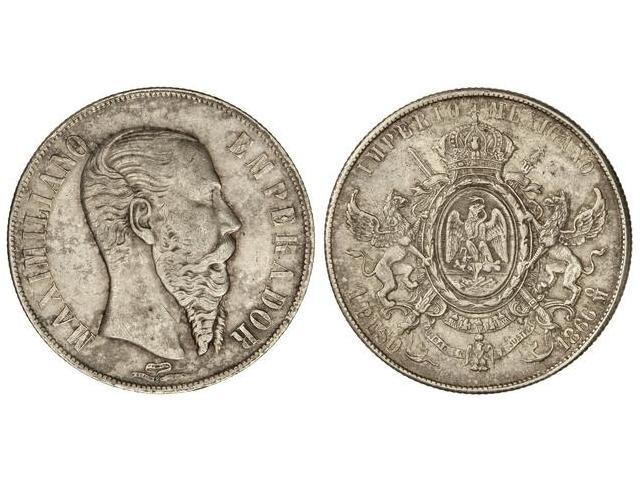 1 Peso. 1866-Mo. EMPERADOR MAXIMILIANO. AR. (Pequeños golpecitos y rayitas). KM-388.1. MBC+.