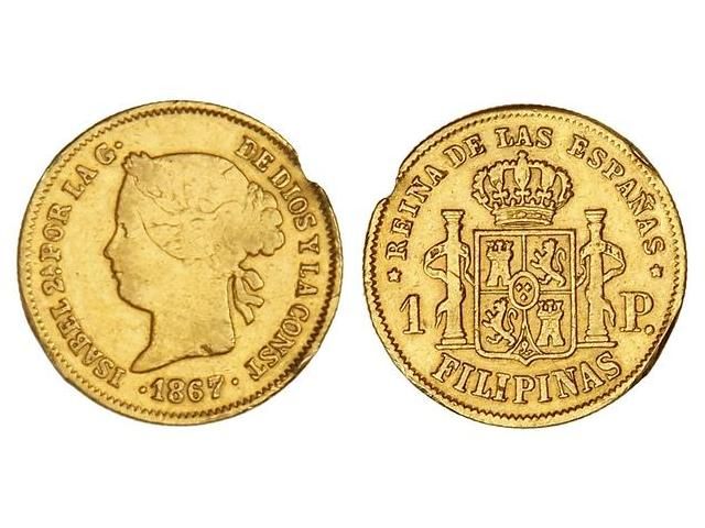 1 Peso. 1867. MANILA. (Ha estado colgada. Restos de soldadura en canto. Cospel algo faltado). RARA. Cal-149. BC+.