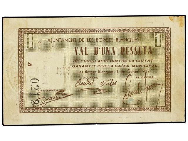 1 Pesseta. 1 Gener 1937. Aj. de LES BORGES BLANQUES. Primer tipo sin pie de imprenta (tirada 500). (Manchita). RARÍSIMO. AT-489; T-579. MBC+.