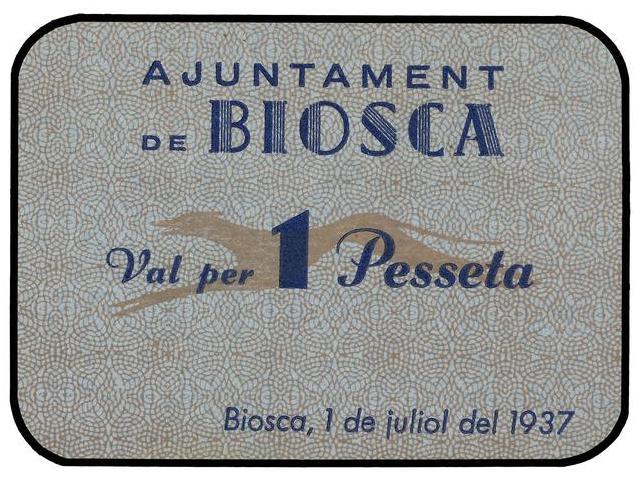 1 Pesseta. 1 Juliol 1937. Aj. de BIOSCA. Cartón. ESCASO. AT-441a; T-517. SC.