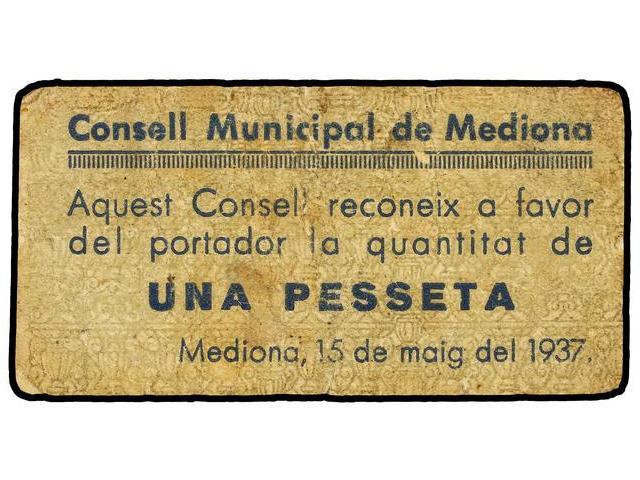 1 Pesseta. 15 Maig 1937. C.M. de MEDIONA. Cartón. (Sucio). AT-1491; T-1712. MBC.