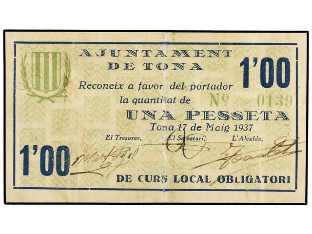 1 Pesseta. 17 Maig 1937. Aj. de TONA. ESCASO. AT-2499. MBC+.