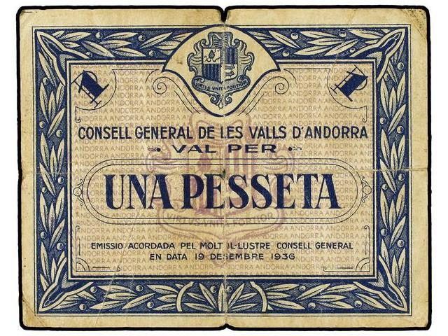 1 Pesseta. - 19 Desembre 1936. - CONSELL GENERAL DE LES VALLS D´ANDORRA. - Azul. (Pliegues y alguna falta de papel). Ed-And2. MBC-. - -