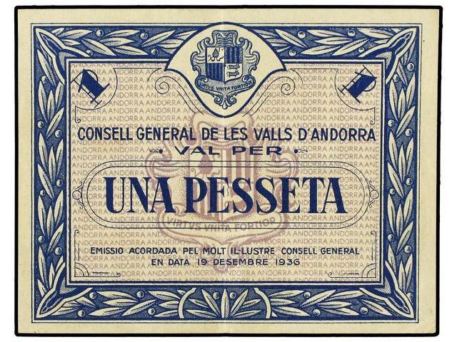1 Pesseta. 19 Desembre 1936. CONSELL GENERAL DE LES VALLS D´ANDORRA. Azul. RARO. Ed. AND 2. EBC-.