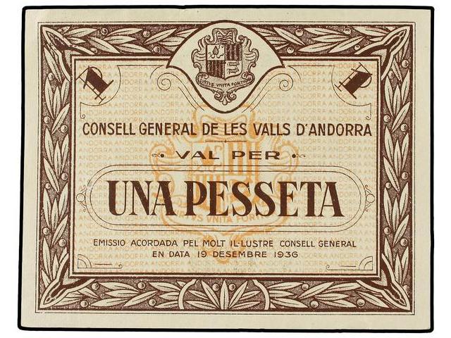 1 Pesseta. - 19 Desembre 1936. - CONSELL GENERAL DE LES VALLS D´ANDORRA. - Emisión marrón. Ed-AND3. SC. - -