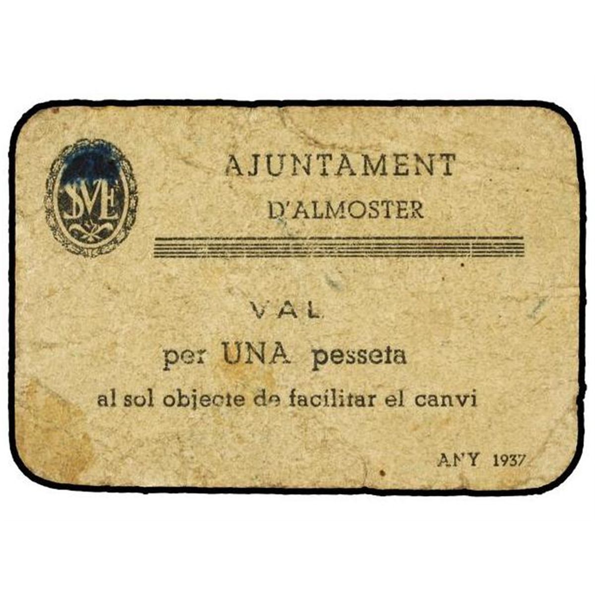 1 Pesseta. - 1937. - Aj. d´ALMOSTER. - Cartón. Muy usado. RARO. AT-125a; T-170. MBC-. - -