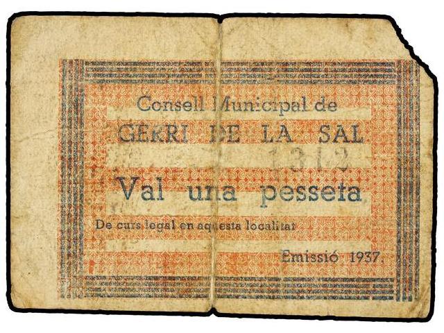 1 Pesseta. 1937. C.M. de GERRI DE LA SAL. Cartón. (Esquina rota). MUY ESCASO. AT-1114; T-1290b. MBC-.