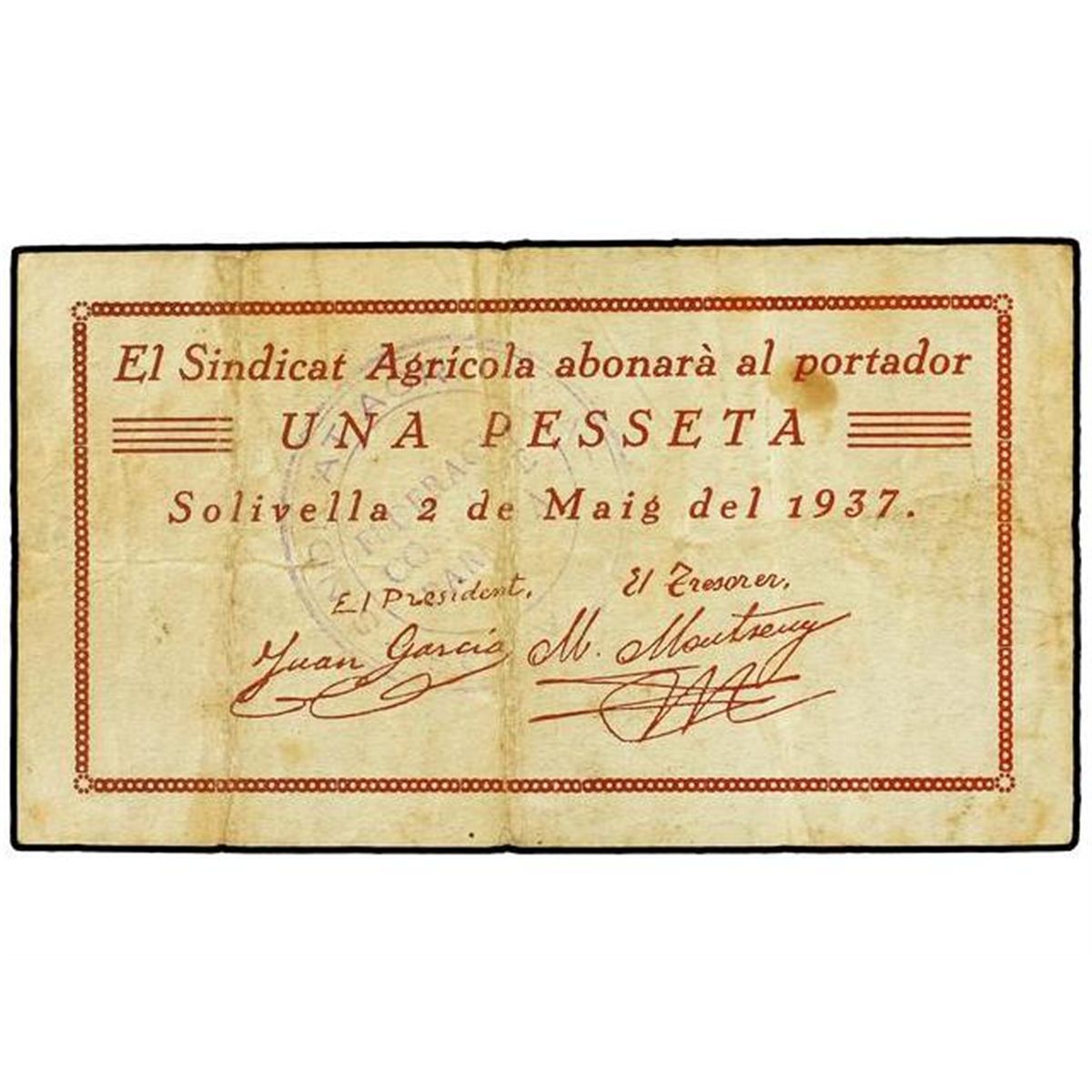 1 Pesseta. - 2 Maig 1937. - SINDICAT AGRÍCOLA SOLIVELLA. - (Algo sucio). MBC. - -