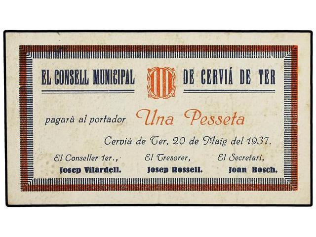 1 Pesseta. 20 Maig 1937. C.M. de CERVIA DE TER. MUY ESCASO. AT-818 ; T-952. MBC+.
