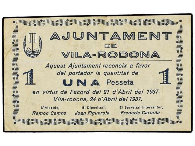 1 Pesseta. 24 Abril 1937. Aj. de VILA-RODONA. AT-2872; T-3318. MBC+.