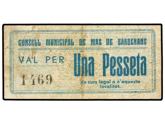 1 Pesseta. - 27 Agost 1937. - C.M. de MAS DE BARBERANS. - Cartón. (Sucio). RARO. AT-1454; T-1660. MBC+. - -