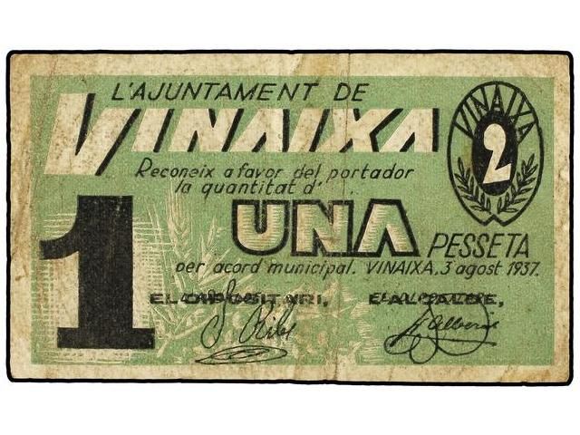 1 Pesseta. 3 Agost 1937. Aj. de VINAIXA. RARO. AT-2910; T-3373. MBC.