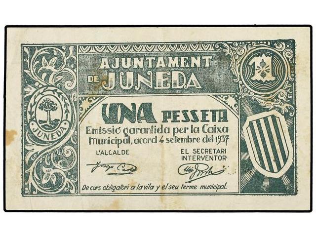 1 Pesseta. 4 Setembre 1937. Aj. de JUNEDA. (Manchas). ESCASO. AT-1293; T-1480. MBC+.
