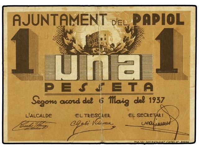 1 Pesseta. 6 Maig 1937. Aj. d´EL PAPIOL. Numeración con la ´N´ de número. (Pequeñas reparaciones con cinta adhesiva en pliege central). ESCASO. AT-1779a; T-2054a. MBC.