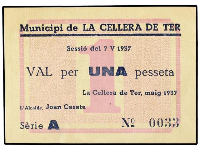 1 Pesseta. - 7 Maig 1937. - M. de LA CELLERA DE TER. - ESCASO. AT-795; T-922. EBC+. - -