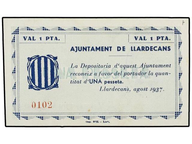 1 Pesseta. Agost 1937. Aj. de LLARDECANS. MUY RARO. AT-1330; T-1523. SC.