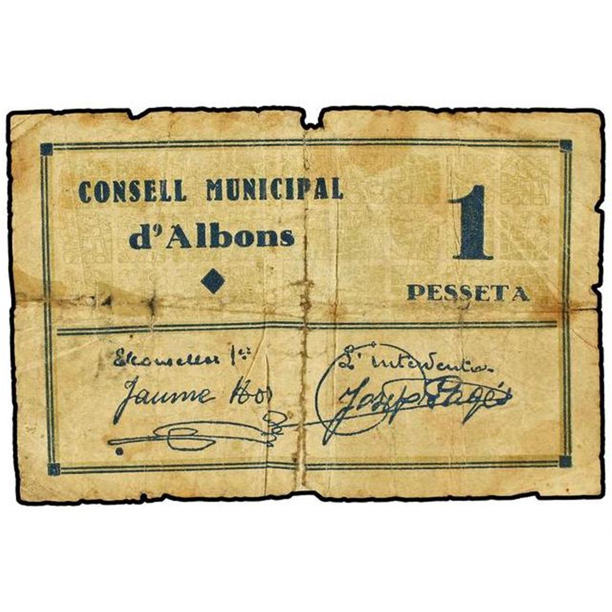 1 Pesseta. - C.M. d´ALBONS. - (Dobleces y reforzado). AT-70; T-93. BC. - -