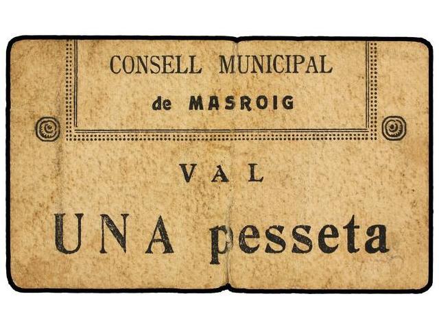 1 Pesseta. C.M. de MASROIG. Cartón. (Algo sucio. Pequeña rotura). RARO. AT-1477; T-1691. MBC-.