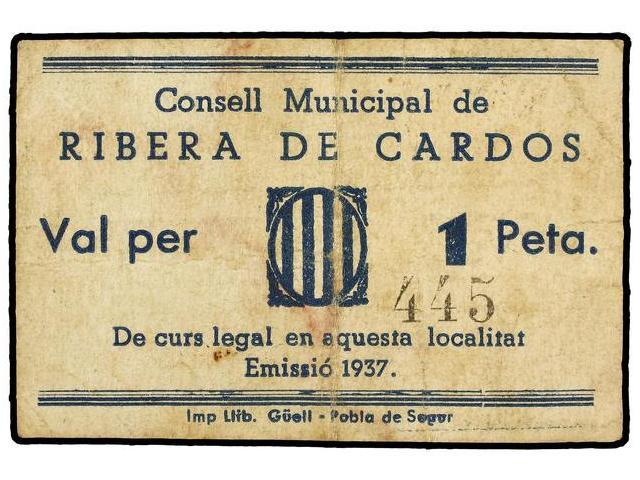 1 Pesseta. Emissió 1937. C.M. de RIBERA DE CARDOS. Tampón negro ovalado ´CONSELL MUNICIPAL DE RIBERA DE CARDOS-U.G.T.-C.N.T.´ en reverso. (Algo sucio). ESCASO. AT-2104c; T-2434c. MBC.