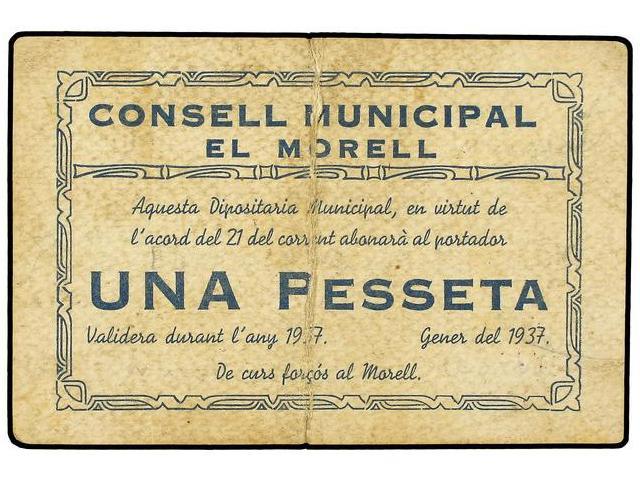 1 Pesseta. Gener 1937. C.M. d´EL MORELL. Cartón. RARO. AT-1622d; T-1867. MBC.