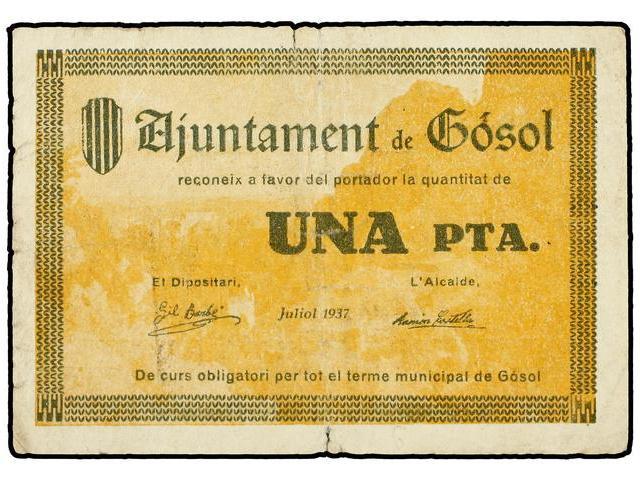 1 Pesseta. Juliol 1937. Aj. de GÓSOL. (Pequeñas roturas). MUY ESCASO. AT-1148; T-1326. MBC.
