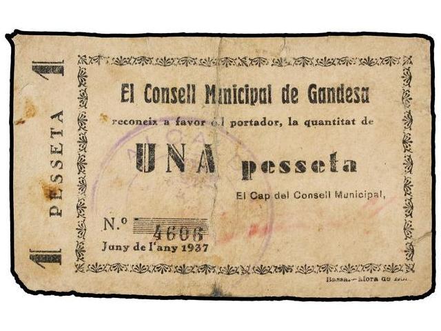 1 Pesseta. Juny 1937. C.M. de GANDESA. Cartón. (Reparaciones). AT-1081; T-1252. BC+.