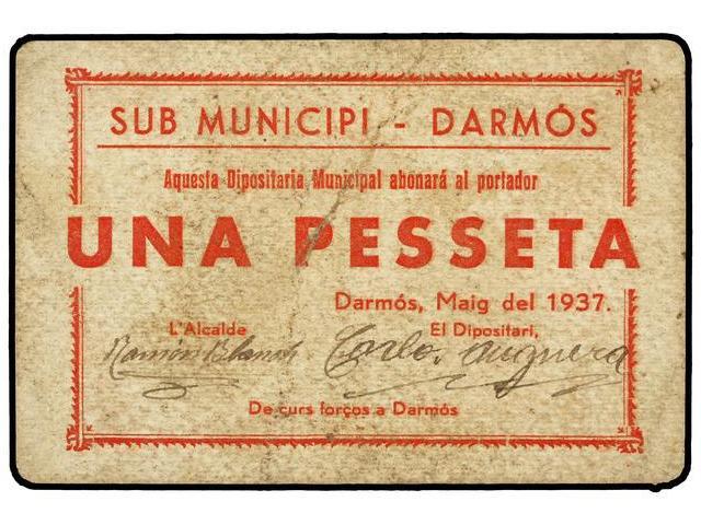 1 Pesseta. Maig 1937. SUB MUNICIPI DARMOS. Cartón. (Sucio). MUY ESCASO. AT-907; T-1045. MBC+.