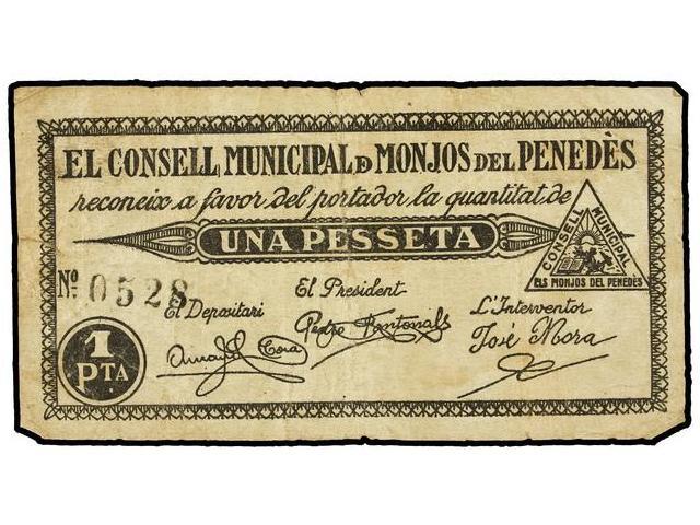 1 Pesseta. S/F. C.M. de MONJOS DEL PENEDÈS. AT-1531; T-1755. MBC-.