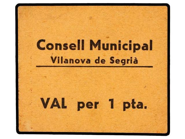 1 Pesseta. S/F. C.M.de VILANOVA DE SEGRIÀ. Sin firma ni numeración. Tampoco sello tampón. (Levísimas manchitas). RARO. AT-2857e; T-3305e. EBC.