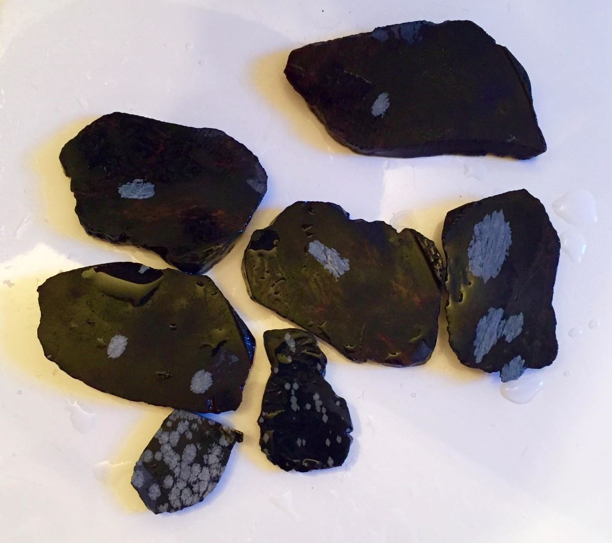 This pound of snowflake obsidian has already been sliced for you. Ready for you to take to the next level. Last few pics are shown wet. Please look closely at pics - they are an important part of our description. Shipping: There will be a $5 handling / packaging fee for shipping this lot. The actual cost of postage will be added on top of that.