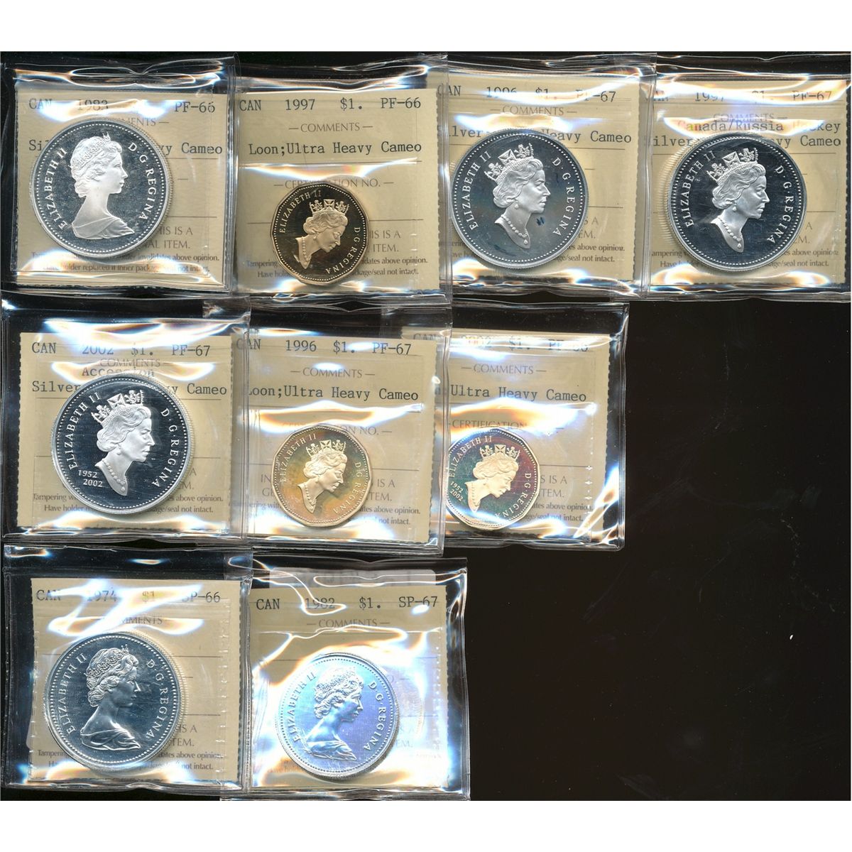 $1 Proof singles 1983 PF66, 1996 PF67, 1997 Hockey & 2002 Accession both PF67, also includes 1996 Loon PF67, 1997 PF67 & 2002 PF66, along with 1982 Nicke SP67, 1974 Silv SP66 Lot of 9 coins all ICCS graded all with Ultra Heavy Cameo Designations.