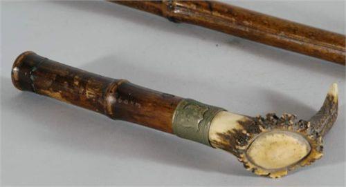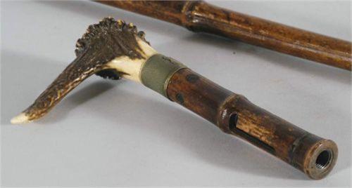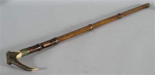 1 RARE ANTLER HANDLE CANE with pistol concealed within, 33" long, with a spring loaded pin fire mechanism and barrel concealed inside shaft, circa 1900, CONDITION: lacking trigger, crack to upper part of shaft, mechanism not tested, PACKING AND SHIPPING (excluding insurance) AVAILABLE WITHIN CONTINENTAL U.S. BY FAIRFIELD AUCTION FOR $30 . BUYER MAY ALSO PICK-UP OR USE A 3RD PARTY FOR PACKING AND SHIPPING