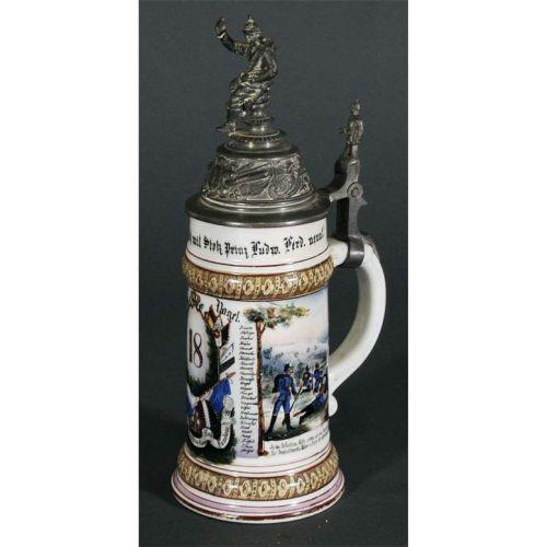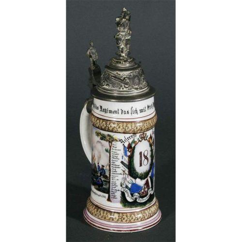 1 REGIMENTAL BEER STEIN<BR>11 3/4" high <BR>CONDITION REPORT: lid a bit loose with crack in back of lid.<BR>PACKING AND SHIPPING (excluding insurance) by Fairfield Auction to points within the Continental U.S.A. (Canada and all other international must be handled by 3rd party shipper) $30.