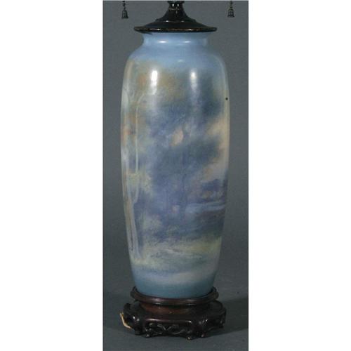 1 ROOKWOOD VASE decorated with a scenic landscape and signed with cypher of Fred Rothenbusch stamped 904C and dated 1937 12" high, drilled for a lamp PACKING AND SHIPPING (excluding insurance) by Fairfield Auction to points within the Continental U.S.A. (international must be handled by 3rd party shipper) $40. CONDITION REPORT: excellent