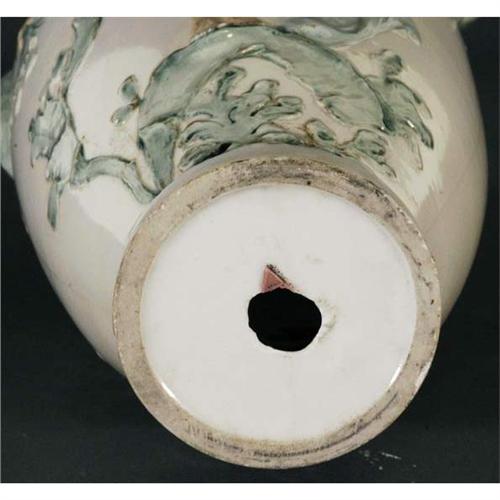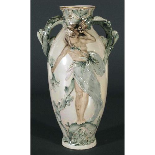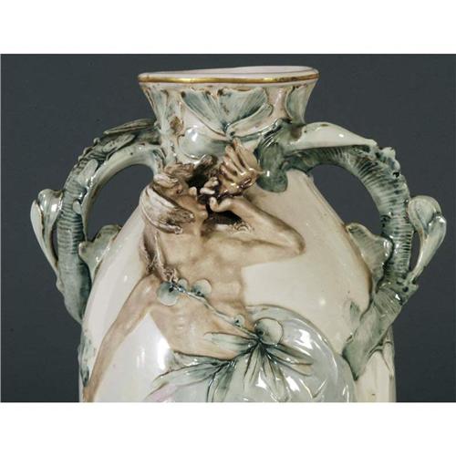 1 ROYAL DUX VASE decorated with a relief figure of an islander blowing a conch shell 14 3/4" high drilled for a lamp PACKING AND SHIPPING (excluding insurance) by Fairfield Auction to points within the Continental U.S.A. (international must be handled by 3rd party shipper) $40. CONDITION REPORT: dirty, light wear to decoration.
