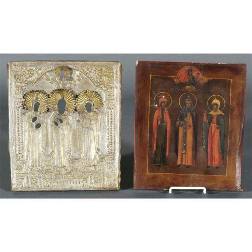 1 RUSSIAN ICON<BR>12"x10" with oklad<BR>CONDITION REPORT: two scuff marks near the Saint's head on left.<BR>PACKING AND SHIPPING (excluding insurance) by Fairfield Auction to points within the Continental U.S.A. (all other international must be handled by 3rd party shipper) $30.