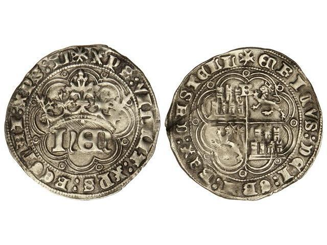 1 Real. - ENRIQUE IV. - BURGOS. - Anv.: ¶XPS:VINCIT:XPS:REGNAT:XPS:IN. hEn coronadas dentro de gráfila lobular. Rev.: ¶ENRICVS:DEI:GRA:REX:CASTELL. Castillos y leones cuartelados dentro de gráfila lobular. B en la parte superior del eje vertical. 3,37 grs. (Raya en reverso). RARA. AB-708.1 var. leyenda. MBC+. - -