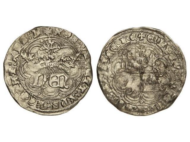 1 Real. - ENRIQUE IV. - BURGOS. - Anv.: ¶XPS:VINCIT:XPS:REGNAT:XPS:R. hEn coronadas dentro gráfila lobular. Rev.: ¶ENRICVS:DEI:GRACIA:REX:CASTELLE. Castillos y leones cuartelados dentro de gráfila lobular. B en la parte superior del eje vertical. 3,39 grs. (Algo repintada). RARA. AB-708.1 var. leyenda. MBC. - -