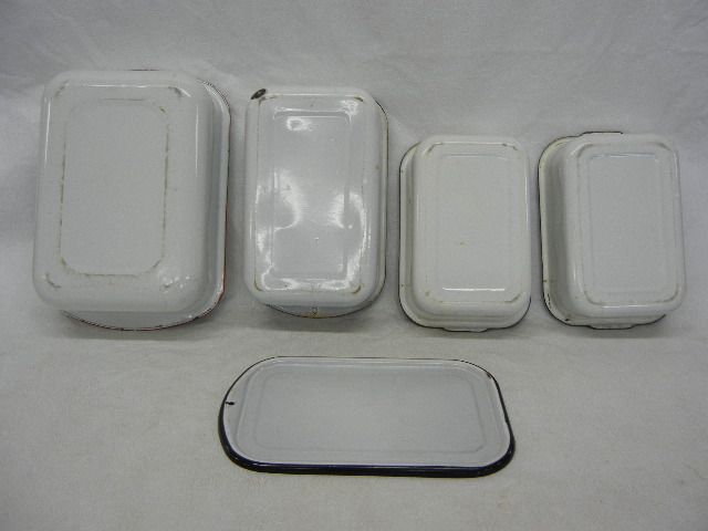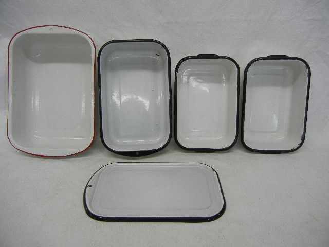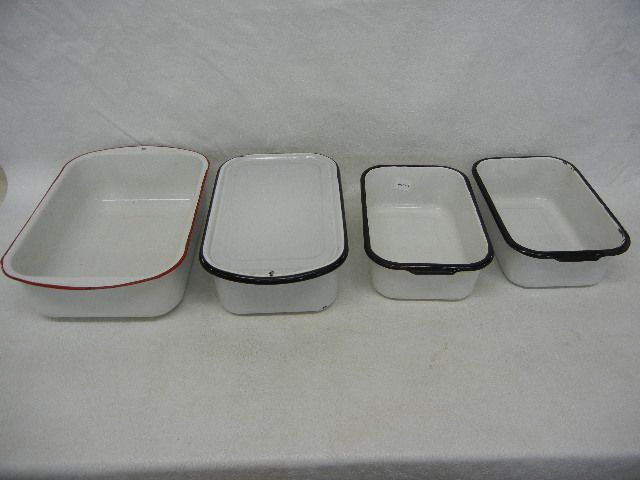 1 Red Rim Enamelware Pan, and 3 Black Rimmed Enamelware w/ 1 Lid