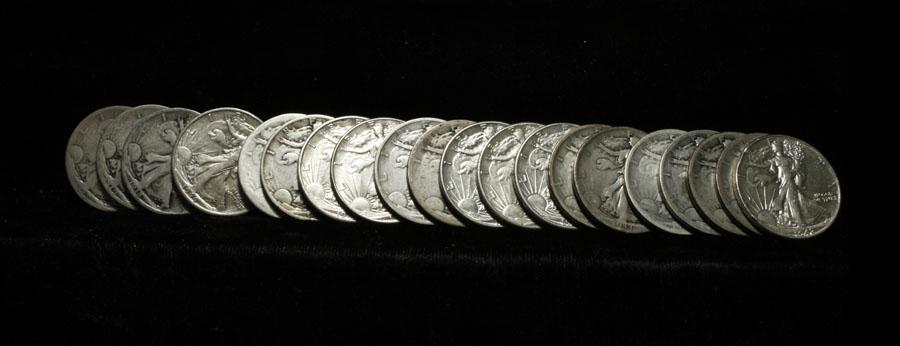 1923-s, 1919-p, 1918-d, 1942-p, 1944-d, 1942-p, 1943-d, 1943-p, 1941-p, 1917-p, 1933-s, 1919-s, 1917-p, 1943-p, 1923-s, 1929-s, 1917-p, 1921-s, 1933-s, 1918-p Most Grade from Good to Fine, with the few later dates being xf-au. Total silver is 7 1/4 ounces of pure silver. Estimated Value $400